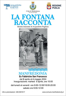“La fontana racconta a Manfredonia – spiega il vicepresidente della Regione Puglia, Raffaele Piemontese – rientra nella corposa programmazione di eventi per il Centenario dell’acqua pubblica a Foggia. Dopo la grande festa di piazza, anche questa mostra ci spinge alla riflessione sul valore della risorsa acqua e sull’importanza della sua tutela. Fotografie e cimeli esposti ci riportano a un passato faticoso e appassionante che ha posto le basi per quello che Acquedotto Pugliese è oggi, una realtà dinamica, punto di riferimento in Italia e in Europa per innovazione e vocazione alla sostenibilità”.