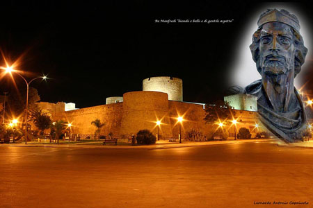 Vide giusto re Manfredi: non furono soltanto ragioni politiche, militari, strategiche ad indurlo a ricostruire l’ormai spenta Siponto a un tiro di sasso, nel cuore del Golfo. Dovette essere qualcosa di più a convincerlo. Manfredi, il re “biondo e di gentile aspetto” che tanto amò la bellezza in tutte le sue espressioni non poté che restare avvinto dal fascino del luogo, così pieno di incanto, così magico, così diverso nei sui tanti aspetti da sembrare una antologia del mondo. Dovette avvertire il lungimirante sovrano lo stesso fremito d’amore che duemila anni prima aveva spinto un altro re, Diomede, reduce dalla guerra di Troia e amareggiato dall’infedeltà della moglie a cercare fortuna, a costruirsi una nuova vita sulla riva del Golfo, dove approdò al termine del suo lungo pellegrinaggio.