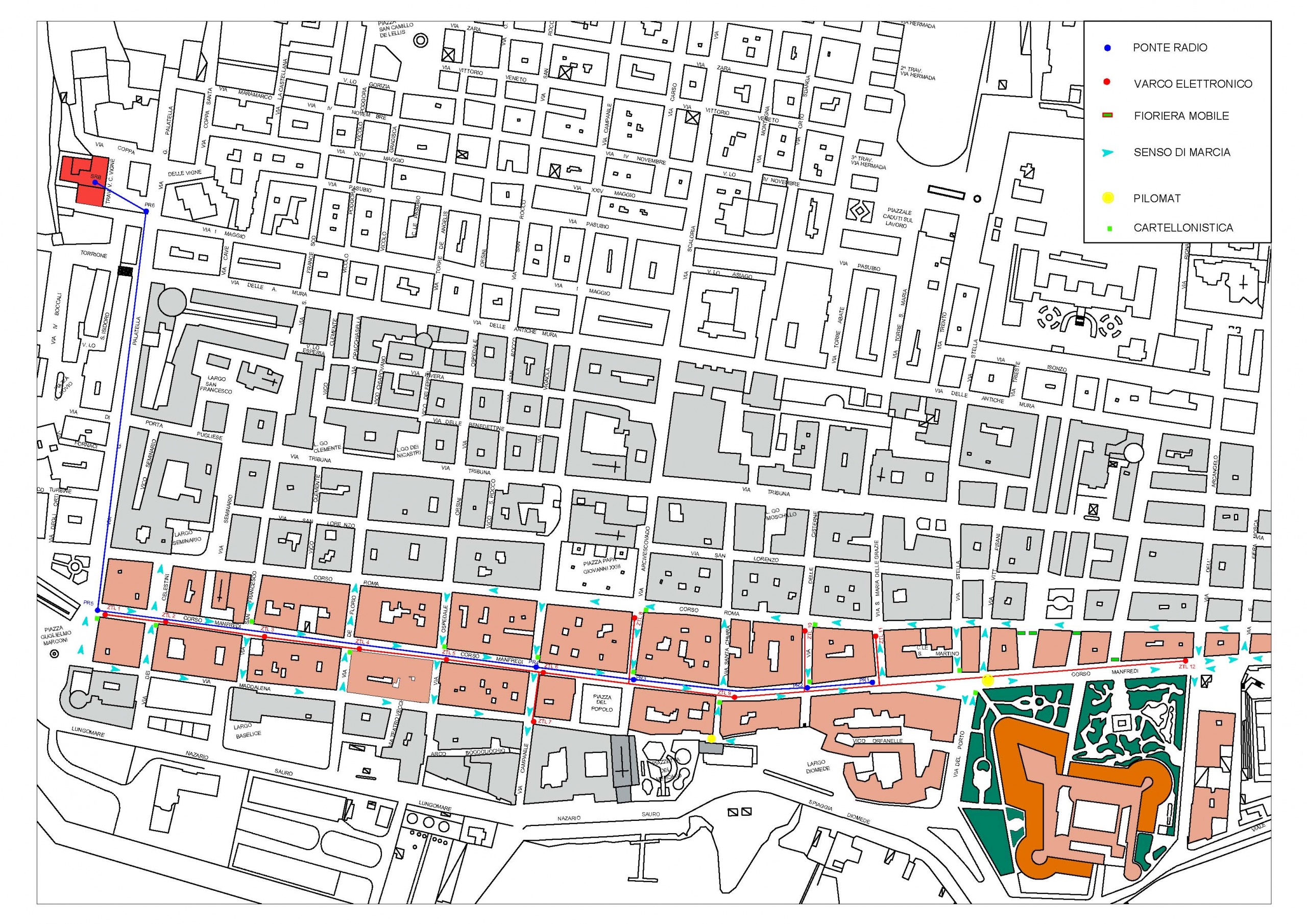 La nuova ZTL, con accessi muniti di varchi di controllo elettronico, è dunque individuata nell’area racchiusa dall’intersezione delle seguenti vie: Piazza Marconi – Corso Manfredi, varco di controllo n.1; Via Dei Celestini – Corso Manfredi, varco di controllo n. 2; Via S. Francesco – Corso Manfredi, varco di controllo n. 3; Via De Florio – Corso Manfredi, varco di controllo n. 4; Via Ospedale Orsini – Corso Manfredi, varco di controllo n. 5; Via Campanile – Corso Manfredi, varco di controllo n. 6; Via Campanile – Via Maddalena, varco di controllo n. 7;m Via Arcivescovado – Corso Roma, varco di controllo n. 8; Via S. Chiara – Corso Manfredi, varco di controllo n. 9; Via Delle Cisterne – Corso Roma, varco di controllo n. 10; Via S. Maria delle Grazie – Corso Roma, varco di controllo n. 11; Corso Manfredi – Via Dell’Arcangelo, varco di controllo n. 12; Corso Roma – Via Ospedale Orsini, varco di controllo n. 13; Corso Manfredi – Via Pisani, varco di controllo n. 14; Via Maddalena – Piazza Marconi, varco di controllo n. 15; Via Maddalena – Via Dei Celestini, varco di controllo n. 16; Via Maddalena – Via S. Francesco, varco di controllo n.17; Via Maddalena – Via De Florio, varco di controllo n. 18.